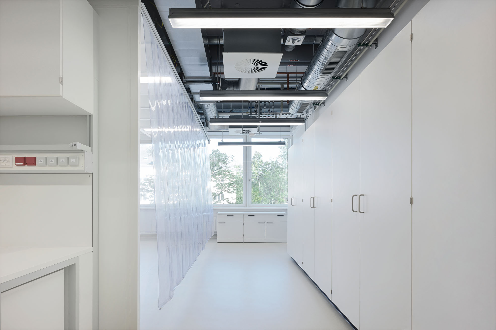 Das Forschungsgebäude beherbergt hochinstallierte Labore und Werkstätten, Büroarbeitsräume, eine Vielzahl an Funktionsflächen sowie dezentral verteilte, frei nutzbare Kommunikationsflächen, die Innovation und Kooperation im Gebäude fördern. Die Labor- und Büroräume sind entlang der Fassaden angeordnet, die Büros im Norden und die Labore im Süden. Die Kommunikationsbereiche schieben sich als räumliche Filter dazwischen.