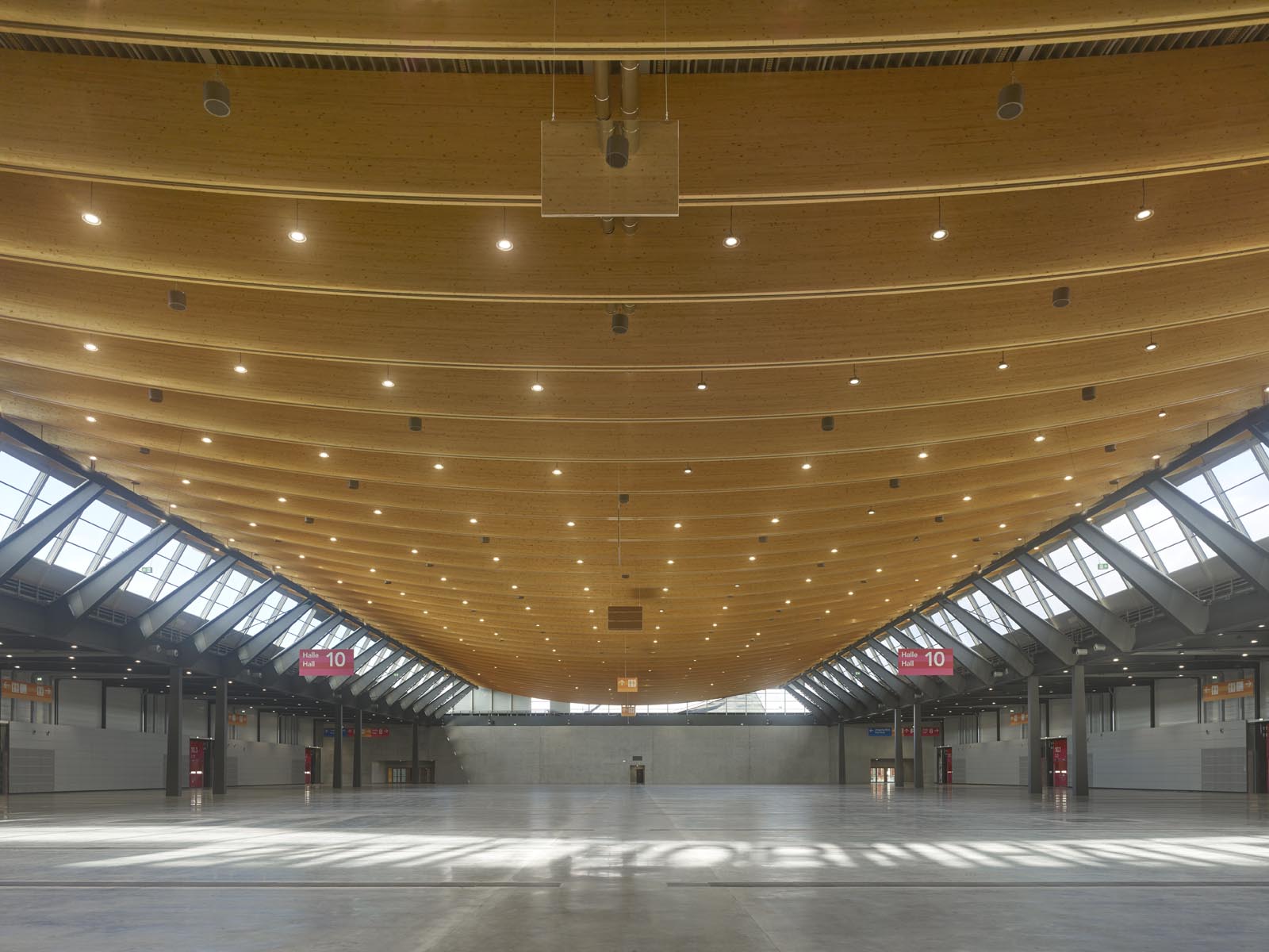 Die besondere Herausforderung des Entwurfs bestand darin, eine Messehalle zu planen, die den geschwungenen Charakter und die Maßstäblichkeit zu den bestehenden Hallen der Stuttgarter Messe aufgreift, jedoch in ihrer Dimension weder die einer Standardhalle (10.500 qm) noch die der Hochhalle (20.900 qm) besitzt. Aus dieser Startposition entwickelten wir das Konzept der dreischiffigen Messehalle mit einem markant geschwungenen Dach über dem Mittelschiff, das in Holz ausgeführt wurde. Die Größe des Mittelschiffs übernimmt dabei die Maßstäblichkeit der Standardhallen.
