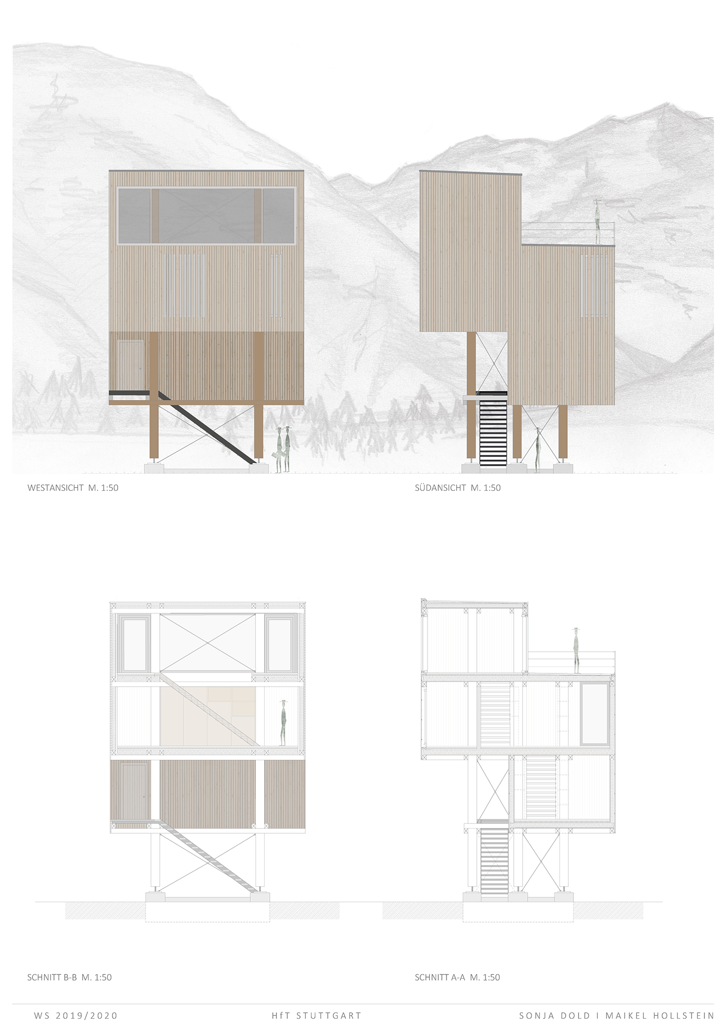 Die 3 Bereiche Technik, Wohnen und Beobachten werden aufeinandergesetzt und bilden ein dreigeschossiges Gebäude mit Flachdach. Stützen und Balken aus Lerchenholz bilden die Tragstruktur. Die Raumsequenzen (,,Eis“) werden um ein zentrales, vertikales Treppenmöbel organisiert (,,Stiel“). Gezielt gesetzte Punktstützen nehmen die Lasten auf und fassen sie in einem Einzelfundament (,,Hand“) zusammen.