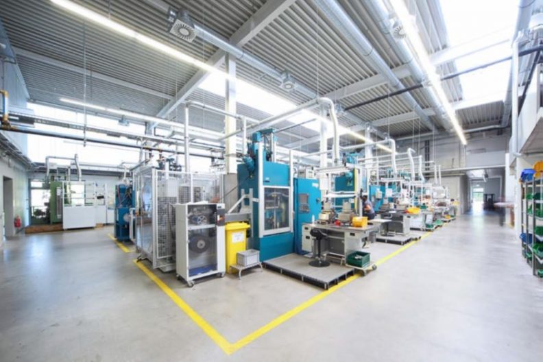 Die mittig angeordnete, eingeschossige Produktionshalle verfügt über eine lichte Höhe von 8,00 m und bietet damit ausreichend Volumen und Platz für technische Installationen wie Luftabsaugung der Spritzgussmaschinen etc.