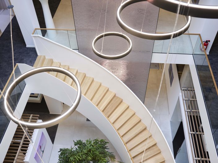 Zum einen sorgt die neue Logistikhalle – 51.000 m² BGF – mit aktuellster Lager- und IT-Technik für hocheffiziente Abläufe; zum anderen bietet das spektakuläre Ausstellungsgebäude Raum für Anwendungsbeispiele, Beratungsinseln und einer multifunktionalen Fläche.