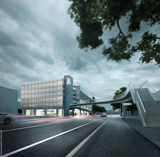 Das Mobility Hub weist im Erdgeschoss eine Ladennutzung und ein Bistro auf. Im 1.OG befindet sich eine Übergabestation für autonome Fahrzeuge, die selbständig in den weiteren Obergeschossen parken können. Von dort führt eine Fussgängerbrücke direkt weiter in die Stadt hinein und zum TCZ. Hosoya Schaefer plant den Mobility Hub, er befindet sich in der Ausführungsplanung und soll 2022 fertiggestellt werden.