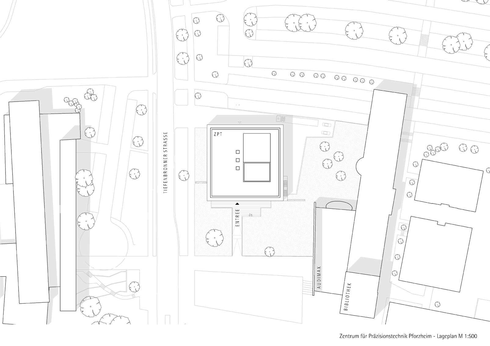 Das ZPT bildet den städtebaulichen Auftakt des Campus der Hochschule Pforzheim an der Tiefenbronner Straße. Der auf einem Hanggeschoss aufgesetzte markante Baukörper definiert das räumliche Gegenüber zur Bibliothek, Audimax und Mensa. Der Haupteingang liegt zentral auf Höhe der Campus-Mitte, dem zentralen Freibereich der Studierenden. Ein innovatives Funktionsgebäude definiert sich vor allem durch seine Anpassungsfähigkeit. Entscheidend dafür sind die umlaufenden Fluchtbalkone, die notwendige Flure im Inneren überflüssig machen und dadurch eine spätere Veränderung der Räume und Nutzungen ermöglichen. Zusätzlich können die einzelnen Geschossebenen mit diesem Konzept über Lufträume eng miteinander vernetzt werden.